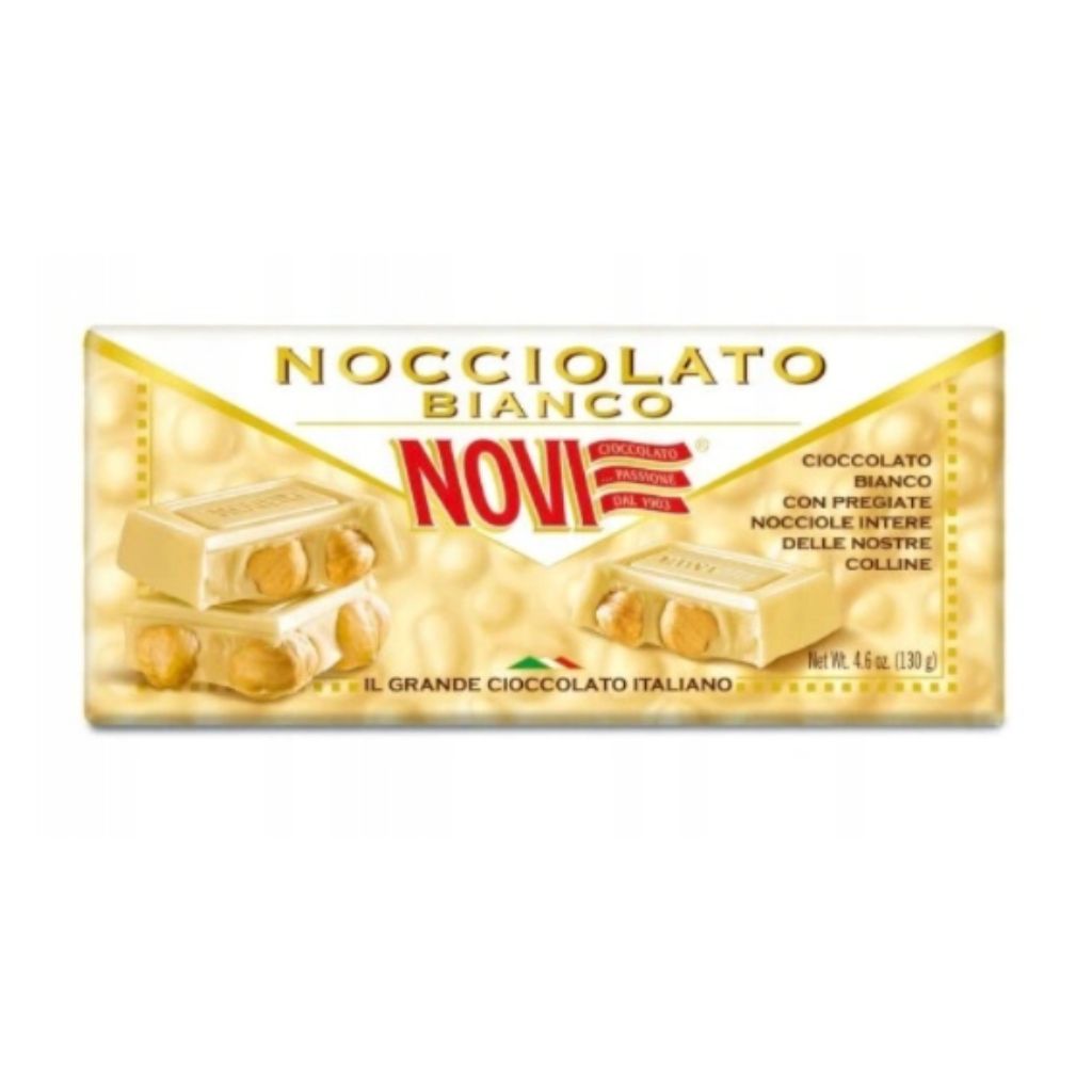 Czekolada biała z orzechami laskowymi 130g Novi to niebiańska rozkosz zamknięta w eleganckiej tabliczce – połączenie delikatnie kremowej białej czekolady z całymi, chrupiącymi orzechami laskowymi, starannie wyselekcjonowanymi we włoskich sadach Piemontu. Każdy kawałek rozpływa się w ustach, oferując idealny balans słodyczy, kremowości i przyjemnej tekstury.