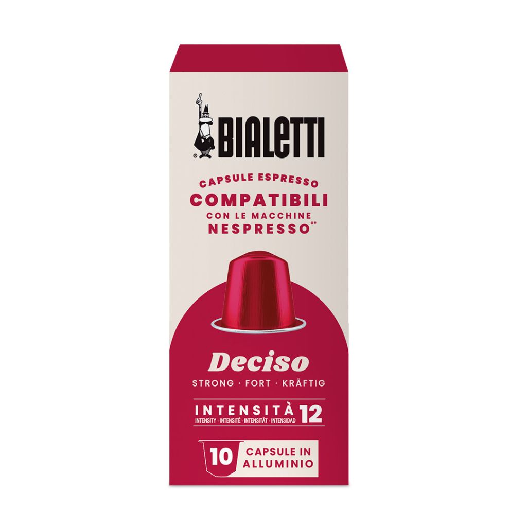 Kawa w kapsułkach Nespresso Deciso – 10 kapsułek Bialetti to zmysłowe espresso o głębokim, czekoladowym charakterze, stworzone z myślą o miłośnikach intensywnych włoskich smaków. Ta ciemno palona mieszanka zachwyca już od pierwszego łyku – bogate nuty gorzkiej czekolady łączą się z gładkim body i wyraźną, elegancką mocą.
