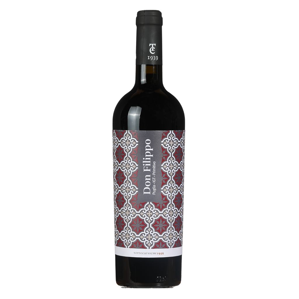 Wino czerwone Primitivo 750 ml Don Filippo to pełna emocji melodia smaków z serca południowych Włoch – Apulii. Mieszanka szczepów Primitivo, Negroamaro i Nero di Troia oferuje unikalną symfonię aromatów: dojrzewające czereśnie, jagody i śliwki tańczą z nutami ziół i delikatnych przypraw. W kieliszku zachwyca głęboki rubinowy kolor i soczyste body, które otula podniebienie, pozostawiając gładki, lekko słodki finisz, idealnie wpisujący się w półwytrawną naturę wina.