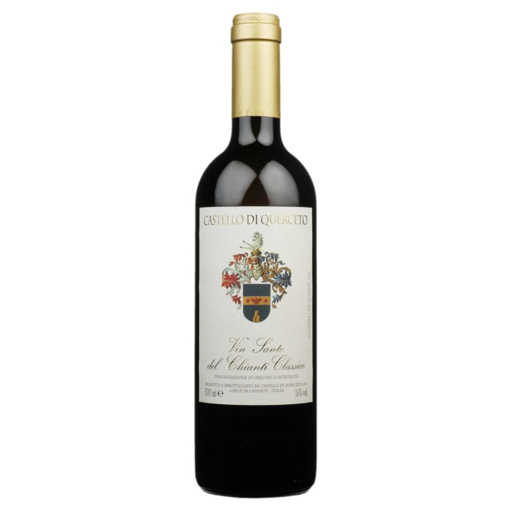Vin Santo del Chianti Classico DOC 750 ml Castello di Querceto to arcydzieło toskańskiego słodkiego winogronowego kunsztu – złocisto-bursztynowy nektar, który opowiada historię tradycji Chianti. Powstaje z późno zbieranej Malvasii i Trebbiano, które przez 2–3 miesiące suszą się, aż nabierają intensywnych aromatów i naturalnej słodyczy. Po fermentacji dojrzewa aż pięć lat w drewnianych beczkach, osiągając niezwykłą głębię smaku, elegancję i bogactwo aromatów.