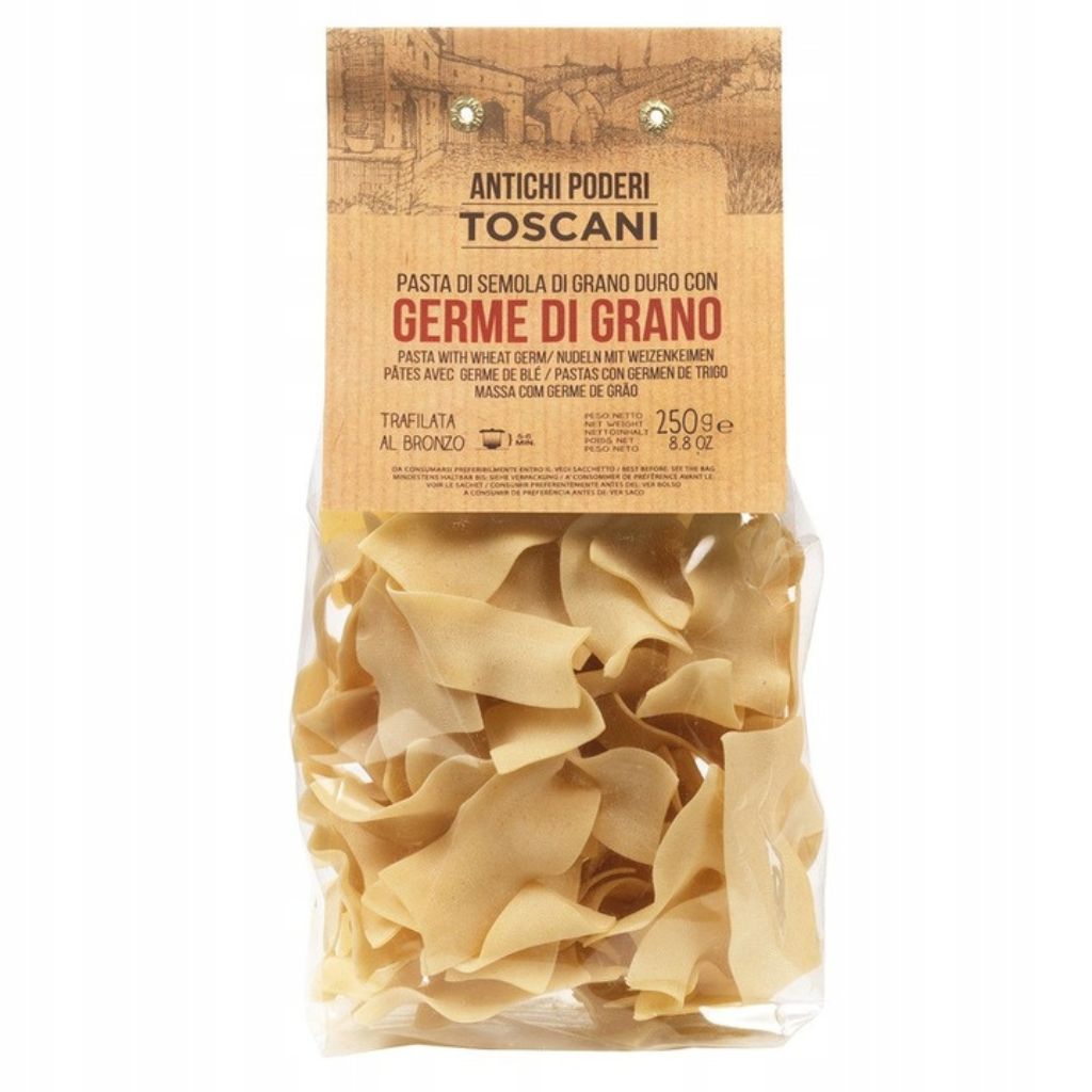 Włoski makaron Germe di Grano 500g Antichi Poderi Toscani to wyjątkowy hołd dla tradycyjnej toskańskiej sztuki kulinarnej. Wzbogacony o 3,5% zarodków pszenicy, zachwyca intensywnym aromatem zbóż i pełnym, lekko orzechowym smakiem, który wyczuwalny jest w każdej nitce.