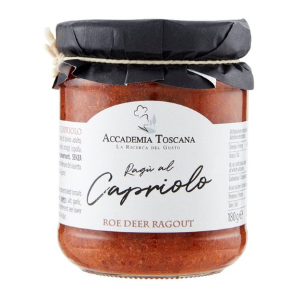 Włoski sos z sarny Ragù al Capriolo 180g Accademia Toscana to prawdziwa perła toskańskiej tradycji kulinarnej. Powstaje z najwyższej jakości mięsa sarny, wzbogaconego wołowiną, świeżymi warzywami, aromatycznymi przyprawami i wyselekcjonowanym winem, według klasycznej receptury bez dodatku konserwantów i glutenu.